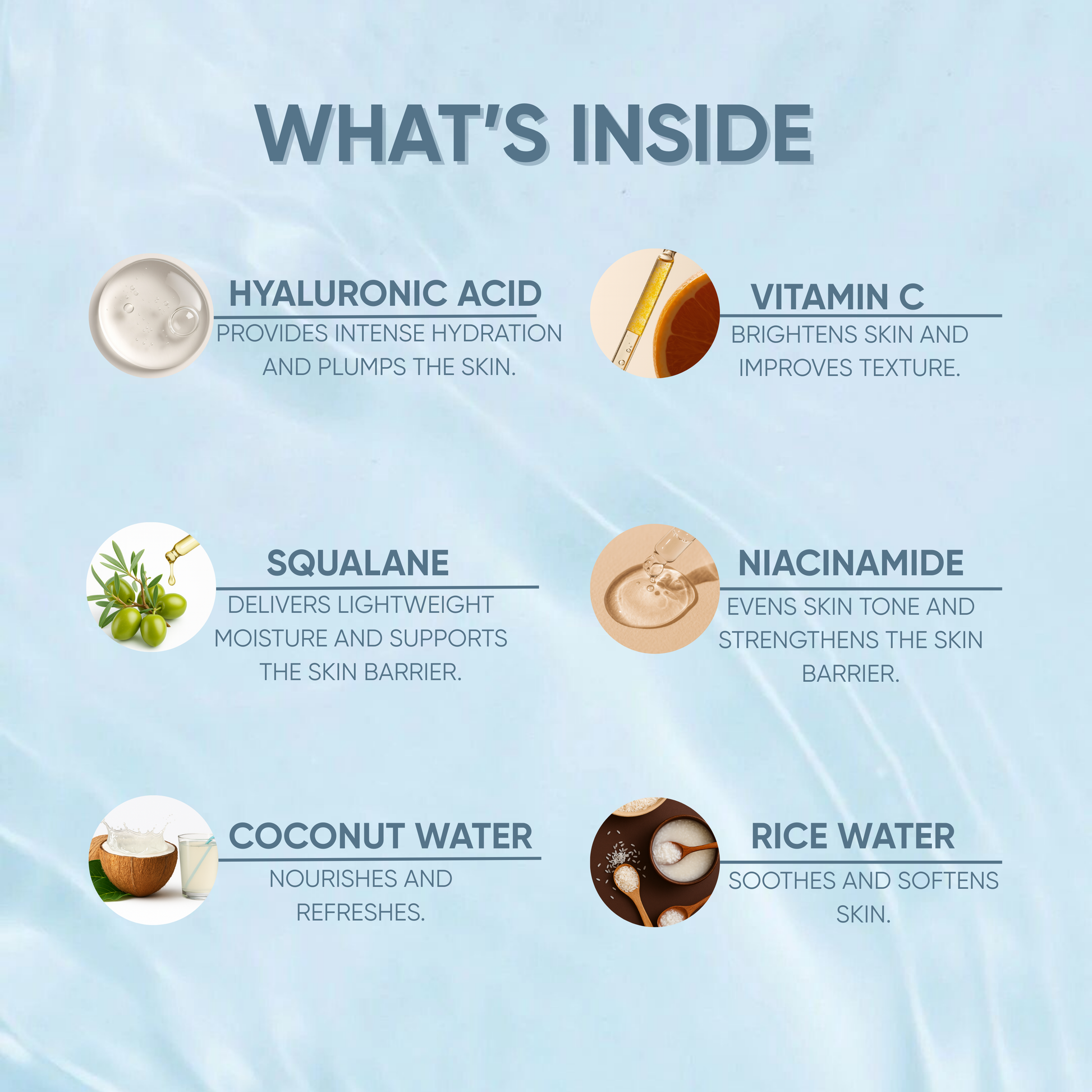 Purified Water, Propanediol, Glycerine, Dicaprylyl Carbonate, Polyacrylate Crosspolymer-6, 1,2-Hexanediol, Phenoxyethanol, Ethylhexylglycerin, Anhydrous Betaine, Allantoin, Sodium Gluconate, Sodium Hyaluronate, Fragrance, Colour, Niacinamide, Ascorbic acid, Squalane, Cocos Nucifera (Coconut) Water, Oryza Sativa (Rice) Extract